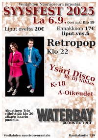 Baarin/kahvion puolella voi taas nauttia illan aikana akustisesta musiikista. Vastaperustettu Waterbay on vesilahtelainen akustinen trio seinäjokelaisella vahvistuksella, joka soittaa rockia laidasta laitaan suomeksi ja englanniksi.